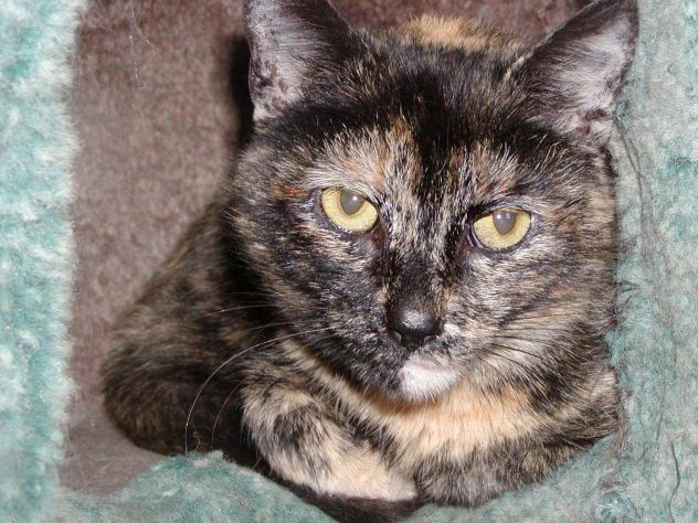 Glitter is an adorable tortoise shell kitty. She's super sweet and friendly. Her coat really does look like glitter when the light hits it. She's also young, a little over a year old, so she'll be a part of your family for a long time.