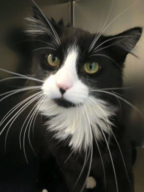 He's afloofy tuxedo kitty. He's likey a Maine Coon, which is a very cuddly and loving breed, but they need to be brushed daily so they don't get matted. This guy was rescued from a kill shelter and he needs your love! He's regal and friendly!